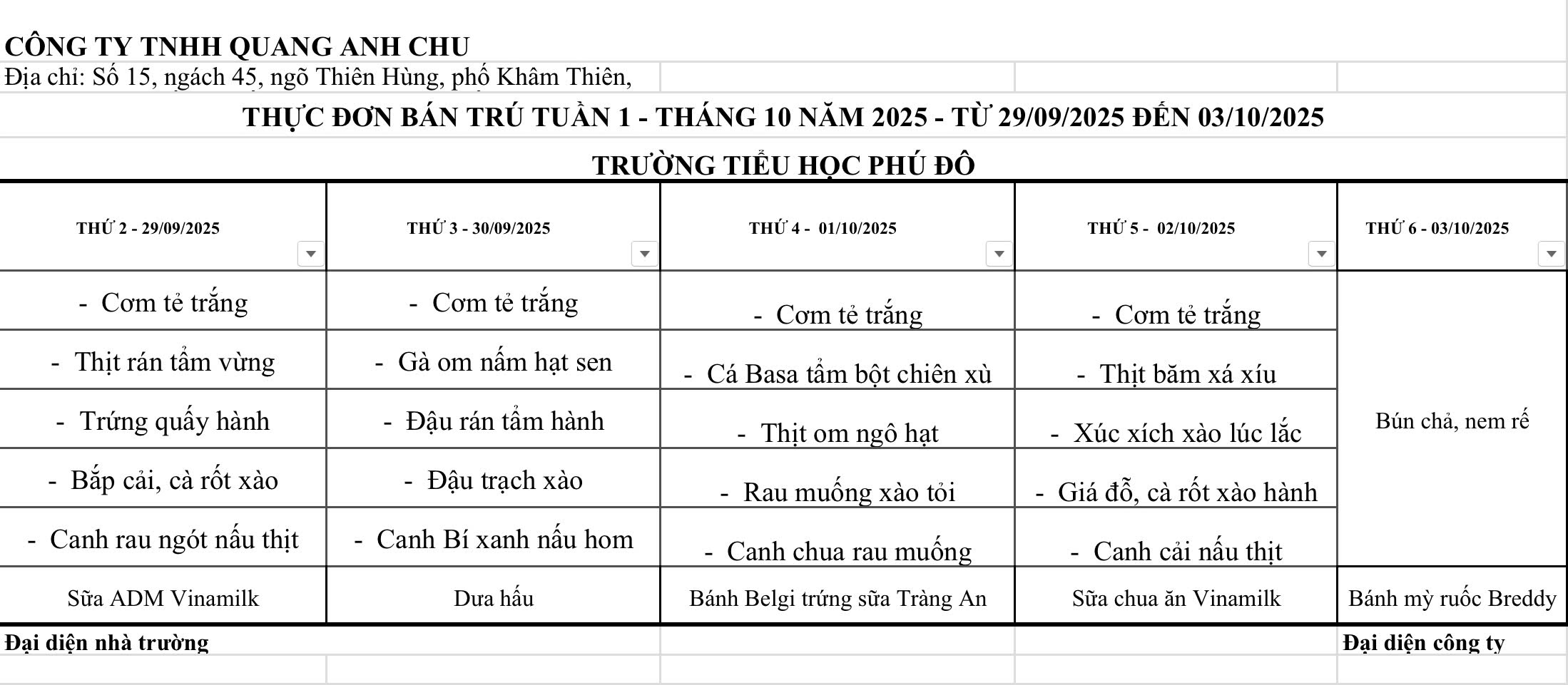 THỰC ĐƠN BÁN TRÚ TUẦN 1 THÁNG 10 NĂM HỌC 2025 – 2026