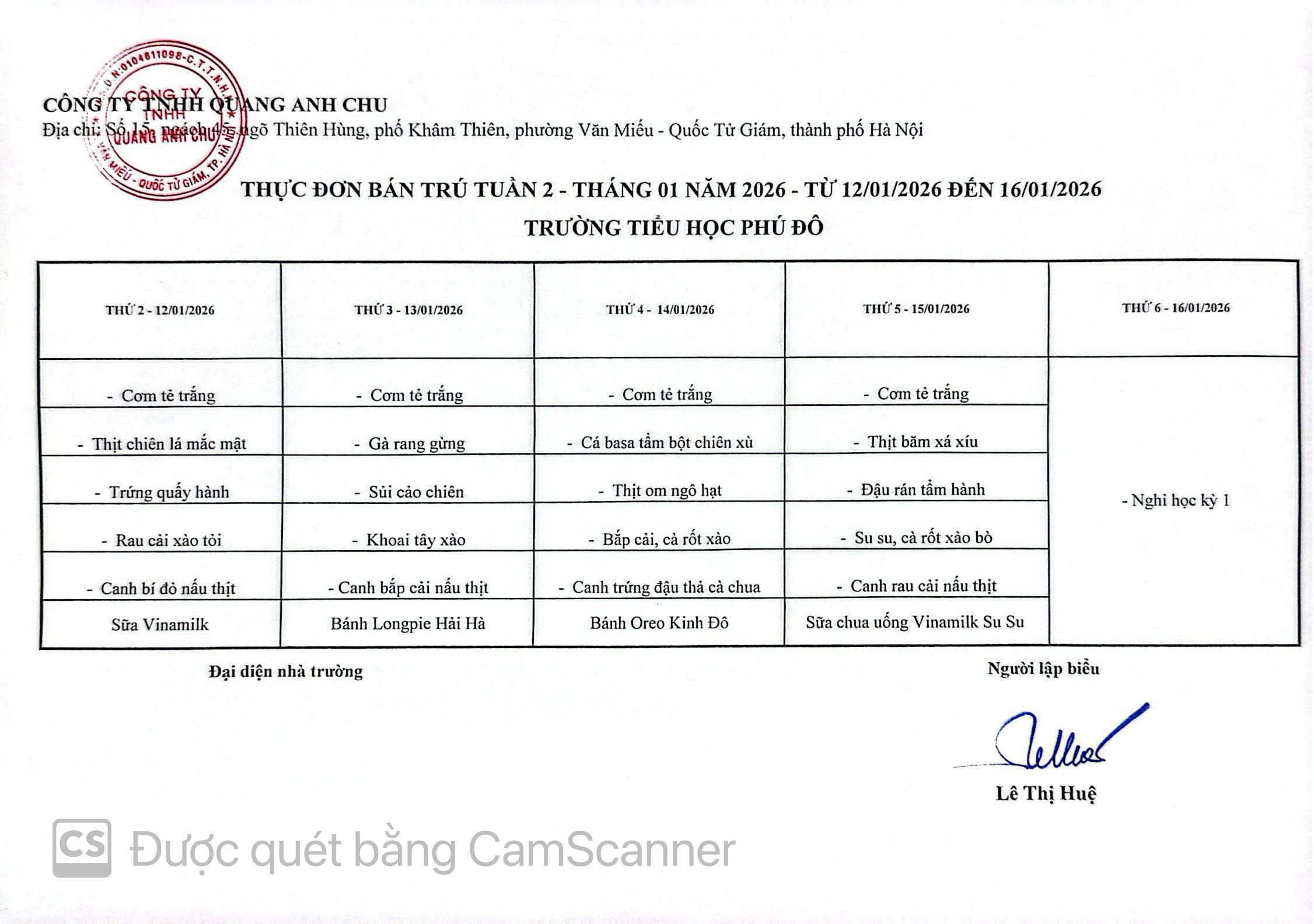 THỰC ĐƠN BÁN TRÚ TUẦN 2 THÁNG 1 NĂM HỌC 2025 – 2026