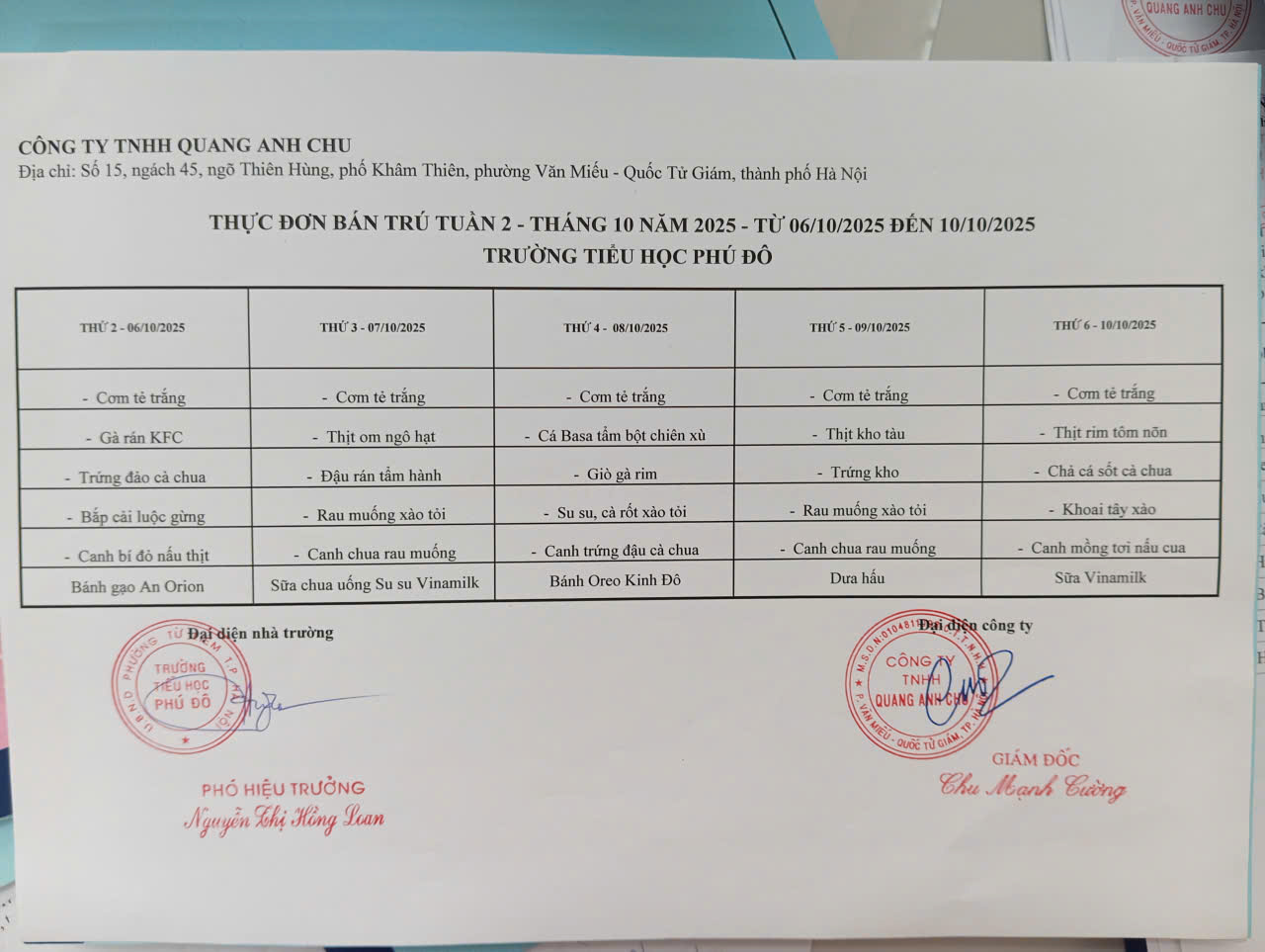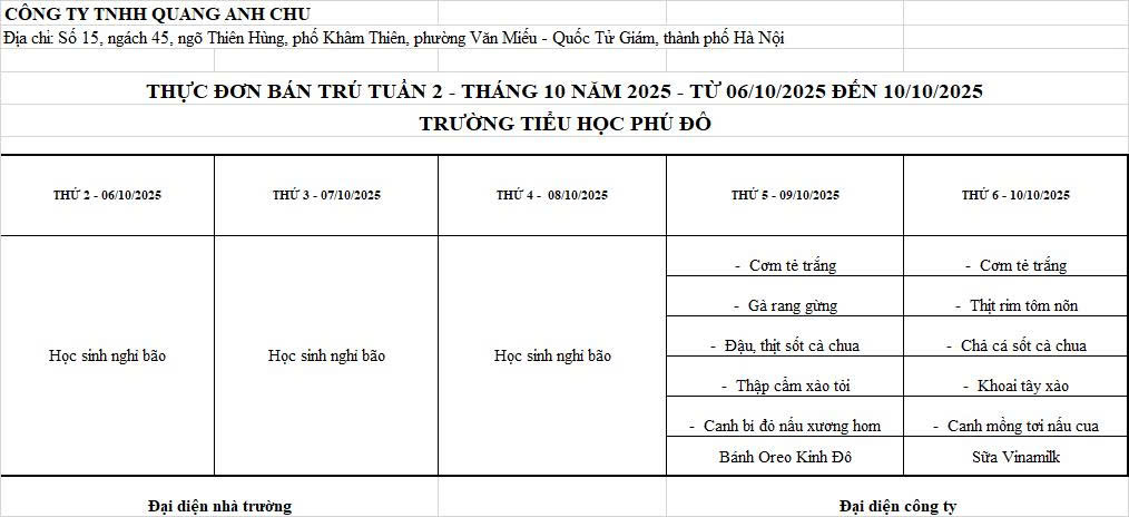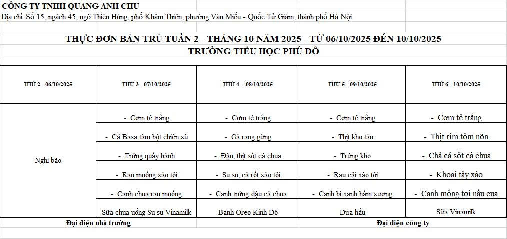 THỰC ĐƠN BÁN TRÚ TUẦN 2 THÁNG 10 NĂM HỌC 2025 – 2026