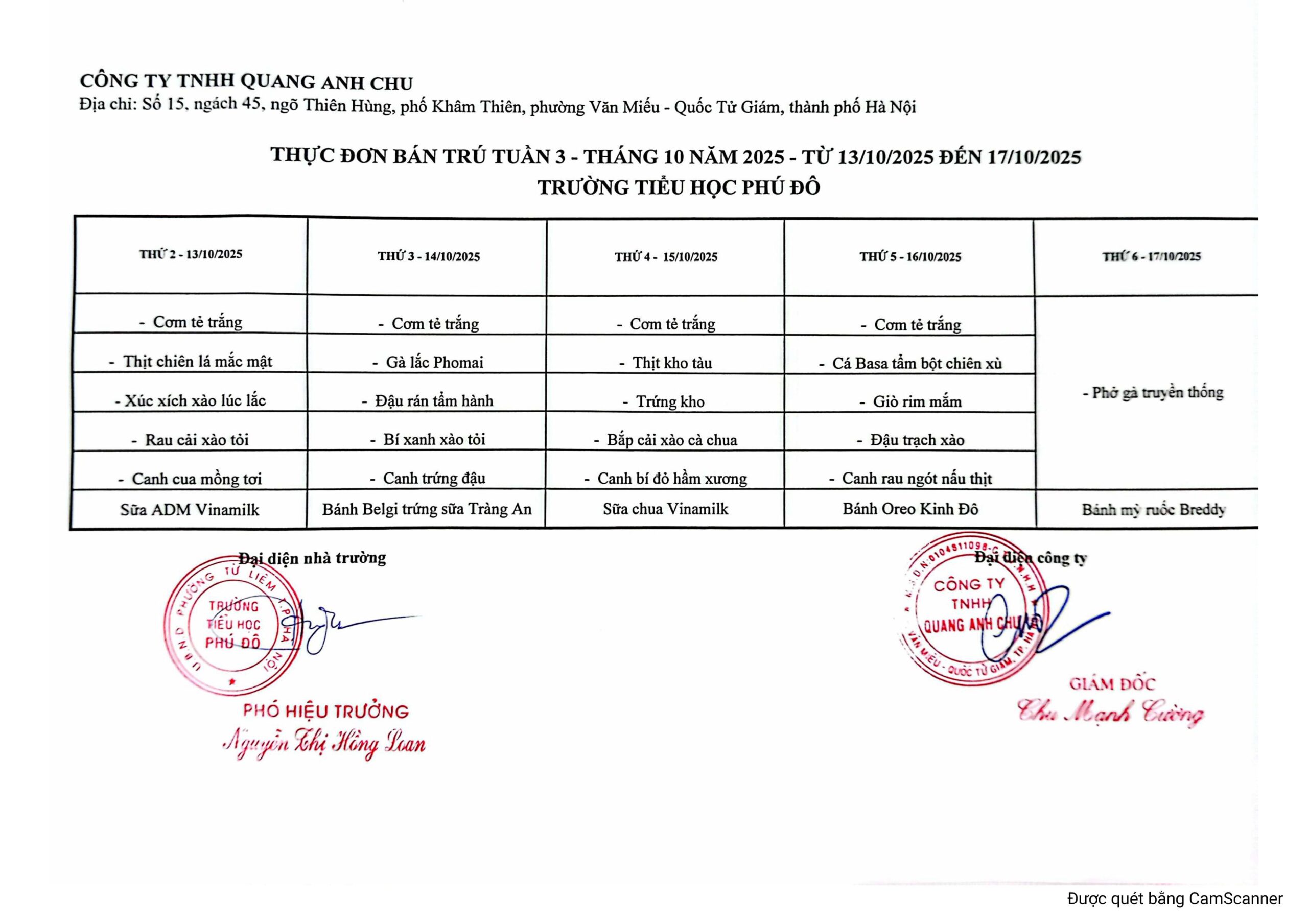 THỰC ĐƠN BÁN TRÚ TUẦN 3 THÁNG 10 NĂM 2025 – 2026