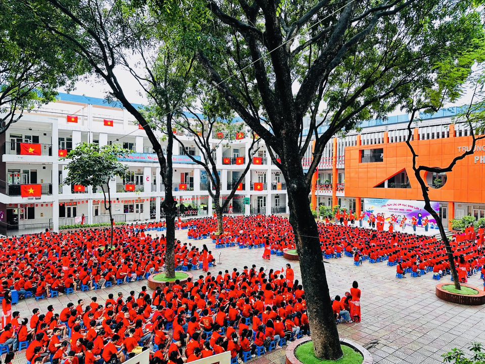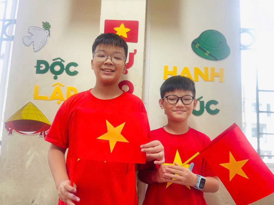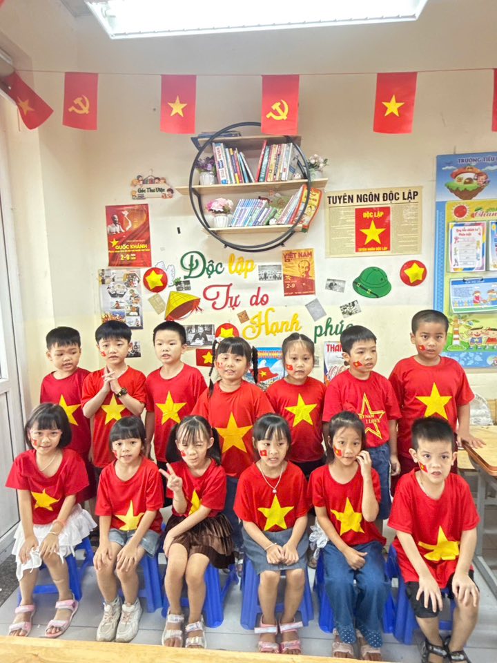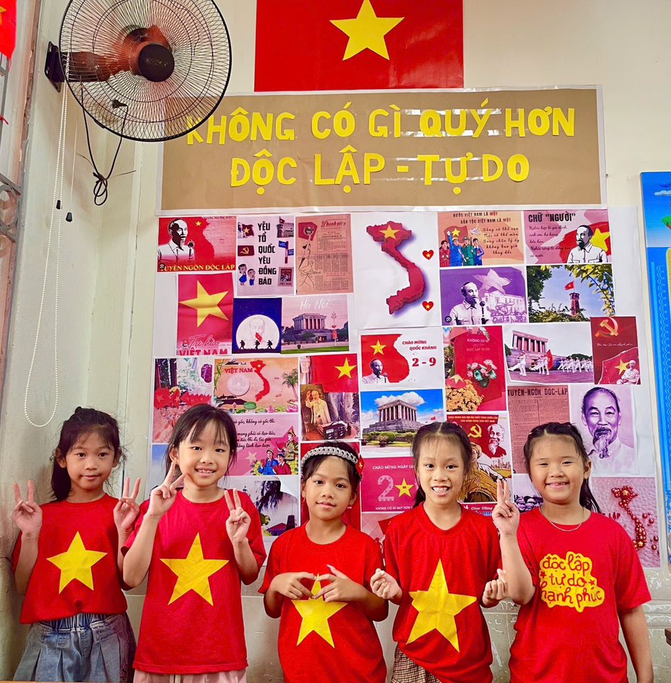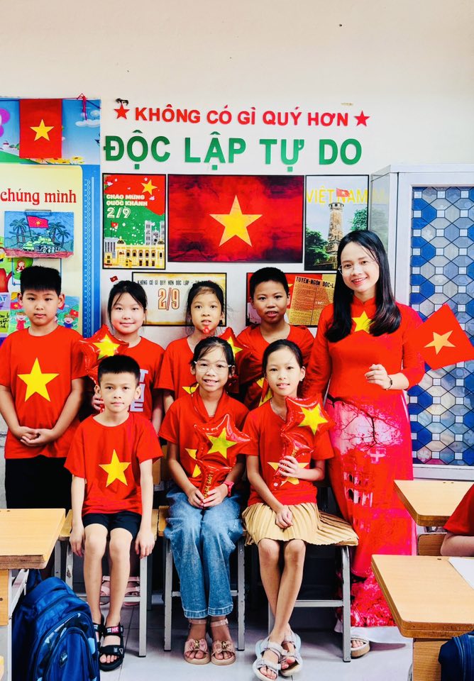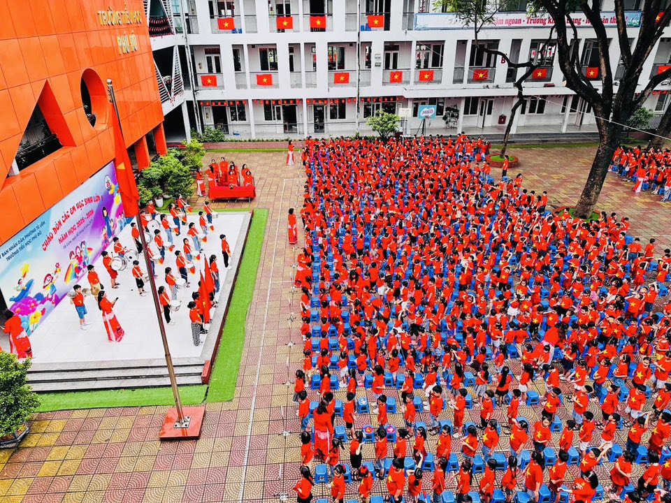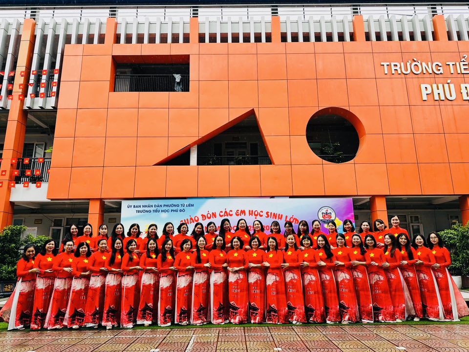 Ngày thu của 80 năm kỷ niệm cách mạng Tháng Tám và Quốc khánh 2/9, sân trường tiểu học Phú Đô bừng sáng một màu đỏ rực rỡ. Màu đỏ của cờ, băng rôn; màu đỏ của muôn chiếc áo mang dáng hình Tổ quốc.